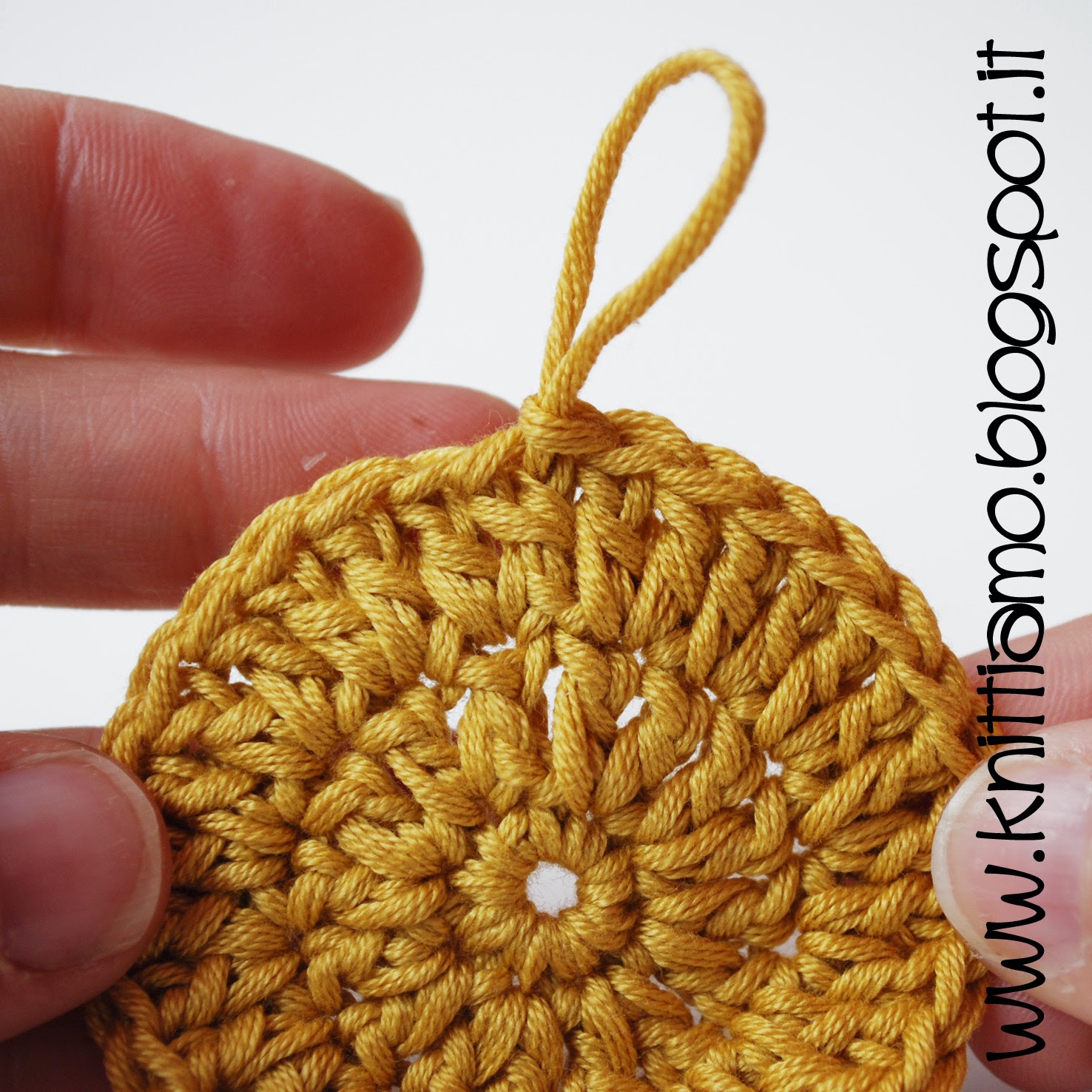Con il filo a tinta unita facciamo un doppio nodo intorno al filo fantasia per creare l’asola del bottone.